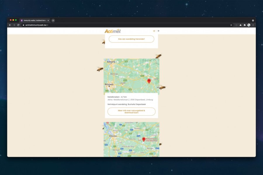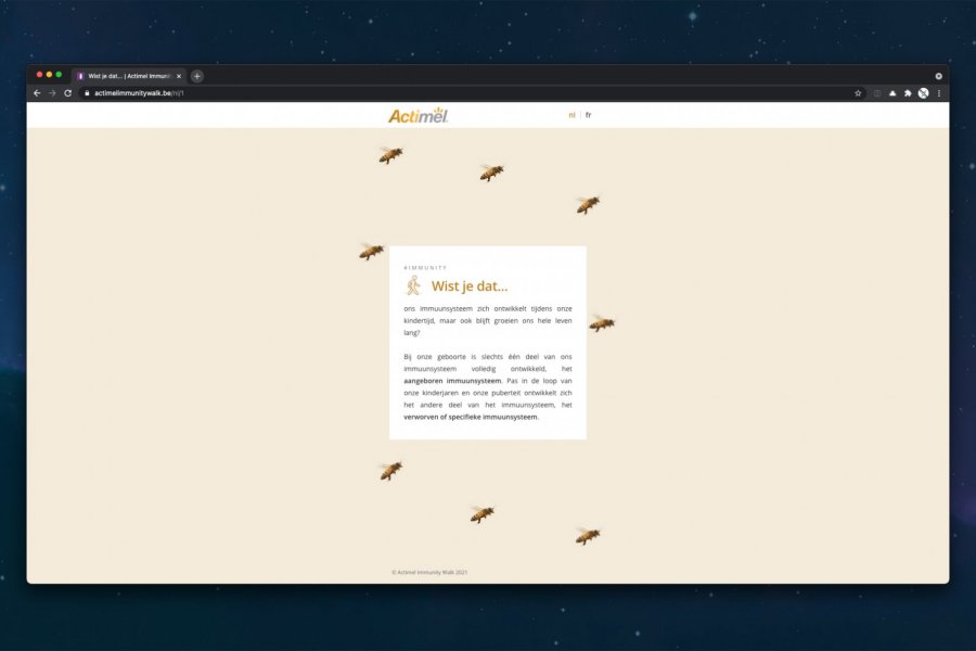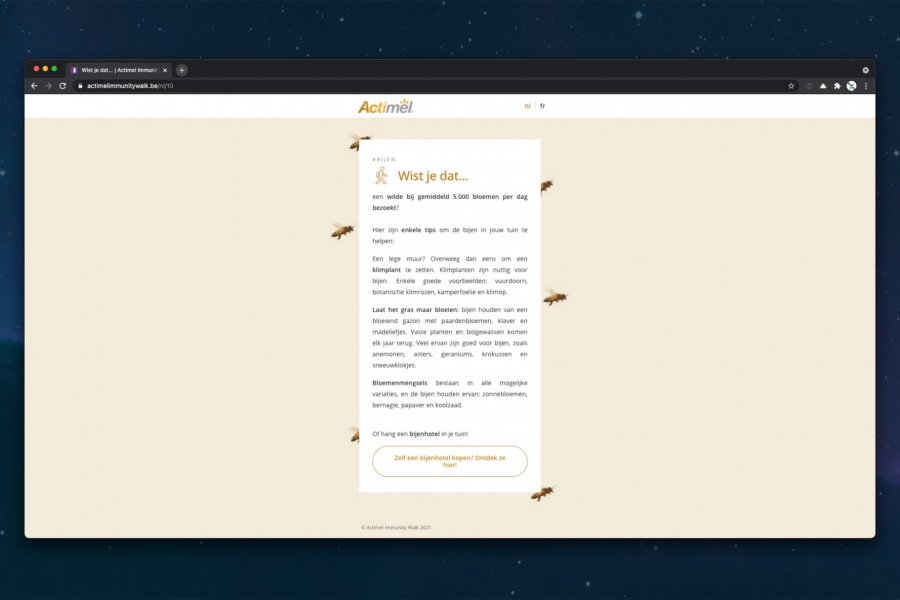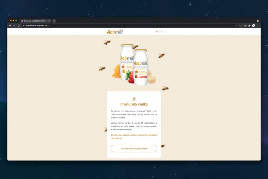Ga samen met Actimel op « Immunity Walk »: een toffe interactieve wandeling die je samen met je bubbel kan doen. Volg de Actimel bordjes & scan de QR codes tijdens je wandeling om toffe weetjes over je immuunsysteem & de bijen te ontdekken!